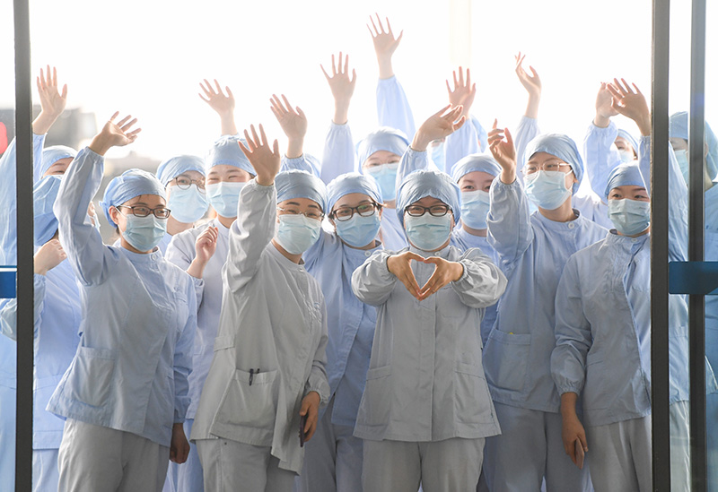 2020年3月23日,武汉市第一医院部分医护人员在武汉天河机场为广东第14批援鄂医疗队送行