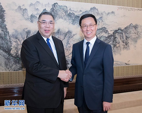 6月28日,中共中央政治局常委、国务院副总理韩正在北京中南海紫光阁会见澳门特别行政区行政长官崔世安。 新华社记者王晔摄