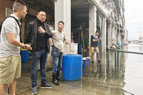 生產力暨科技轉移中心理事長孫家雄昨日亦率部門同事,分批前往內港碼頭、河邊新街、十月初五街及清平直街等低窪地區,向商戶介紹、宣傳升降台、防洪門及水泵兩項資助計劃,即場解答商戶疑問,商戶反應積極。