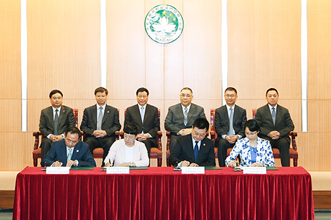 「滬澳合作協議簽署儀式」昨日下午在政府總部舉行。行政長官崔世安、上海市市長應勇、中聯辦副主任姚堅、經濟財政司司長梁維特、上海市副市長許昆林及上海市政府秘書長湯志平見證簽署儀式。