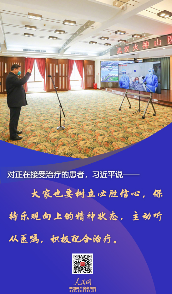 ● 全国人民都在关心关注着你们。医务人员要竭尽所能为大家提供治疗,各方面要关心被感染的群众,照顾好他们的家人,让患者安心接受治疗。