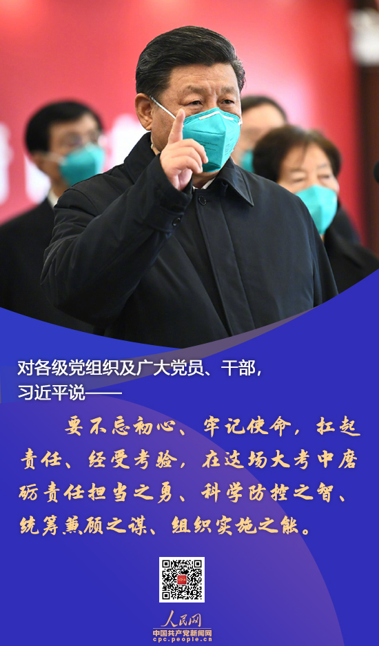 ● 各级党组织和广大党员、干部要不忘初心、牢记使命,扛起责任、经受考验,在这场大考中磨砺责任担当之勇、科学防控之智、统筹兼顾之谋、组织实施之能,做到守土有责、守土有方。