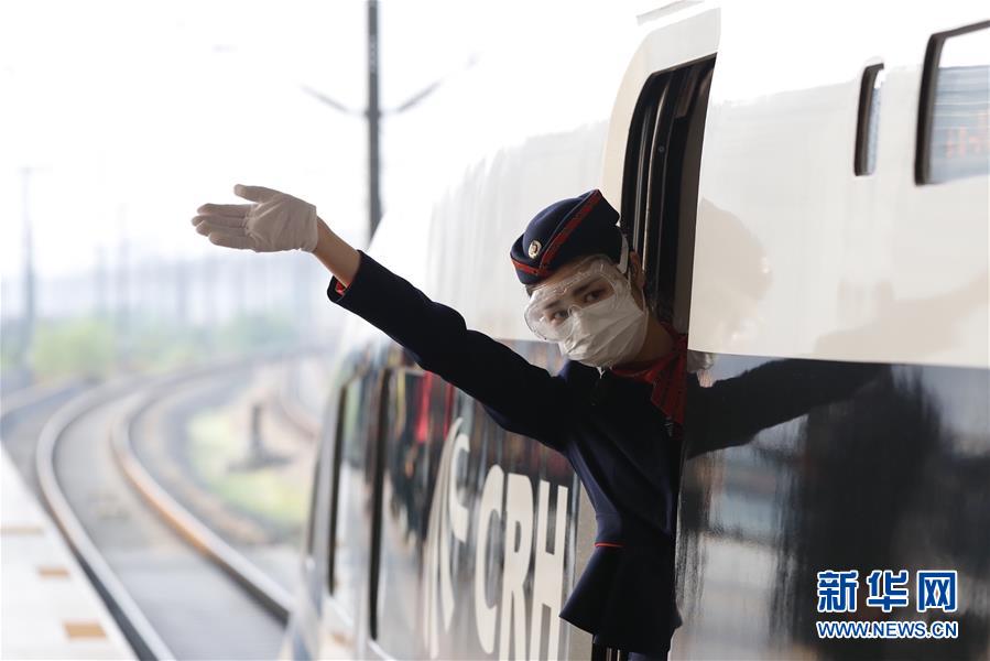 4月8日,在武汉站,G431次列车乘务员在发车前向乘客挥手。 当日,G431次列车由武汉站始发开往南宁东站。这是武汉市正式解除离汉离鄂通道管控措施后开往湖北省外的首趟始发列车。