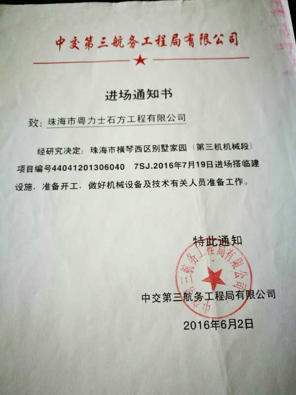 在写了所谓的承包《承诺书》、交纳了10万元押金之后,王先生就开始跟珠海粤力的法人王云鸿开始交涉何时进场经营食堂事宜。但一次又一次,得到的答复是再等等,快了之类。在拖了一段时间之后,王先生感觉情况不对,便赶紧到珠海做现场调查,去到工地一问,珠海市横琴西区别墅家园(第三机械段)的土石方承包方根本不是珠海粤力,而是另外一家公司。那么,当时珠海粤力提供给他看的,加盖有中交第三航务工程局有限公司公章的《合同书》以及《进场通知书》系伪造无疑(记者发现,该《进场通知书》行文格式存在明显的错误,甚至还有错别字)。