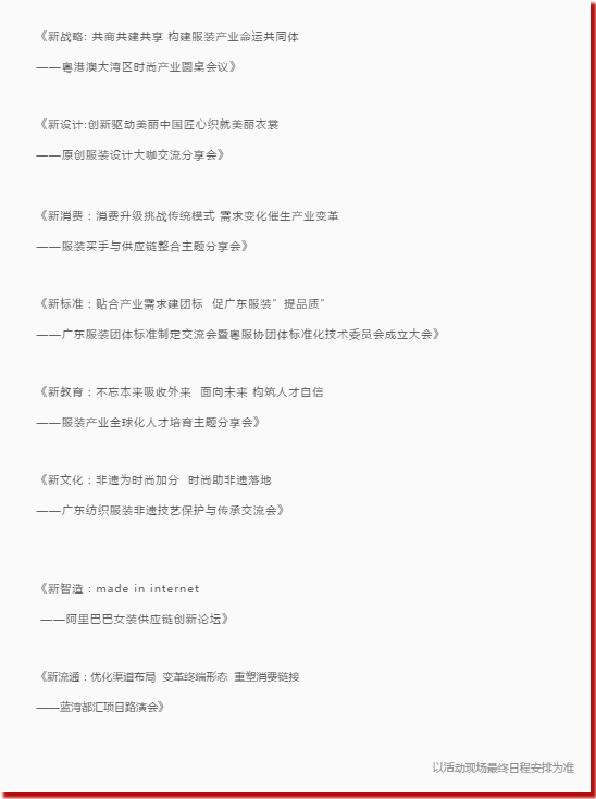 广东时装周组委会一直以远见敢为、开拓创新在国内乃至国际时装周体系著称,2018广东时装周-春季上,组委会还将开创新融入“粤港澳大湾区”概念,首次举办高规格的粤港澳大湾区时尚产业主题会议。此外,在时装周中粤港澳设计师联动展演,创见新时尚舞台,粤港澳设计师将在时装周舞台展示着不一样的时尚。以及还将拟牵头联合广州、深圳、佛山、东莞、惠州、中山、珠海、江门、肇庆和香港、澳门等地重点行业商协会组建“粤港澳大湾区时尚产业联盟”,秉持创新、协调、绿色、开放、共享原则,构建时尚产业命运共同体,优化产业资源配置,以项目为载体,共商共建共享,合力攻坚,抱团发展,优势互补,资源共享,推动粤港澳大湾区时尚产业创新发展,开启粤港澳大湾区时尚新纪元。