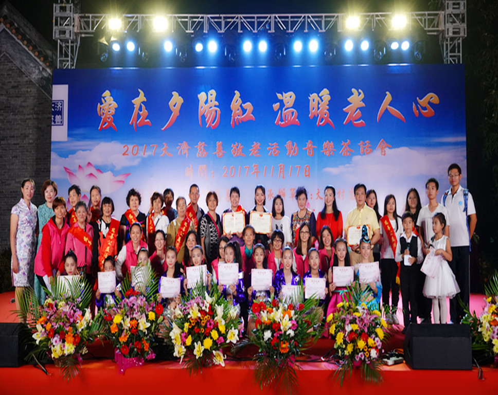2017 年11月17日,「愛在夕陽紅,溫暖老人心」——2017年大濟慈善敬老活動,在廣州市白雲區江高鎮大田村北帝古廟、謝公祠舉行。 本次活動是由大濟慈善主辦、大田村委協辦,大濟慈善、大田村委和各個愛心企業、愛心組織、志願者共同傾力奉獻的一場孝親活動. 在孝與愛的氛圍裡, 大田村各位善長人翁圍桌歡聚,共同度過這一美好的音樂會時光。